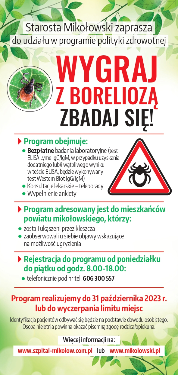 Wyniki badań wykonane w ramach akcji „Wygraj z boreliozą – zbadaj się” będą do odbioru w laboratorium tutejszego Szpitala od dnia 25.11.2025 r do 31.12.2025 r. Po upływie tego terminu zostaną przekazane do archiwum.